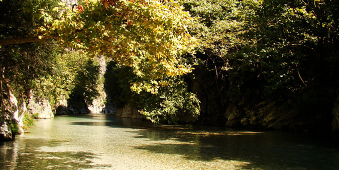 Τα βράχια που υψώνονται δεξιά κι αριστερά του ποταμού (όχθες στα περισσότερα σημεία δεν υπάρχουν) όσο πάνε και στενεύουν, και η σκιά των πλατανιών που επιμένουν να ξεφυτρώνουν από πάνω τους κρύβει τον ήλιο δημιουργώντας απίθανες αποχρώσεις στα πρασινογάλαζα, κρυστάλλινα νερά του ποταμού. Μαζί με τον (ακόμα πιο παγωμένο) Βοϊδομάτη που κατέχει τα πρωτεία, ο Αχέροντας είναι ένα από τα καθαρότερα ποτάμια της Ευρώπης –ακόμα και στα πιο βαθιά του σημεία, διακρίνεται από την επιφάνεια και το τελευταίο βοτσαλάκι στον βυθό.